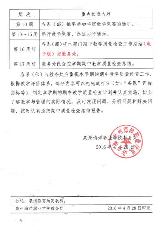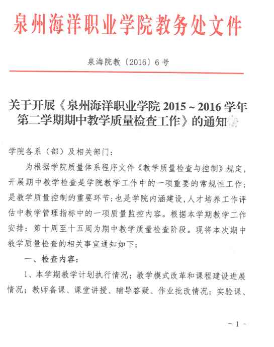 关于开展泉州海洋职业学院2015-2016学年第二学期期中教学质量检查工作