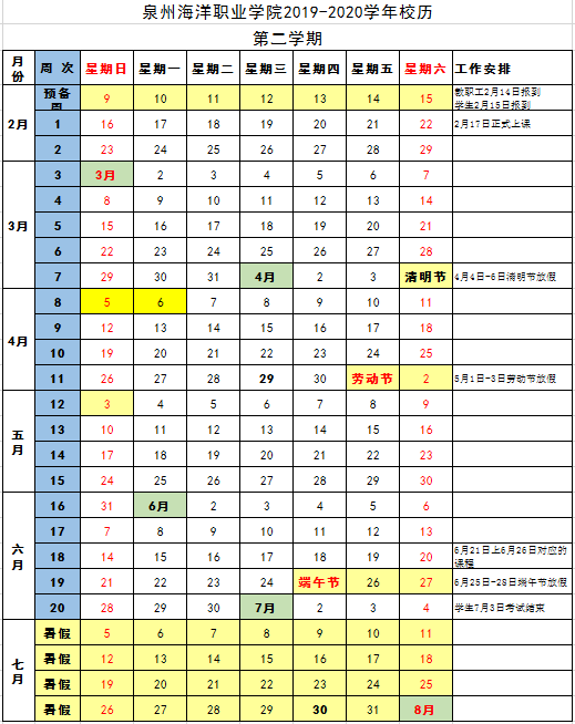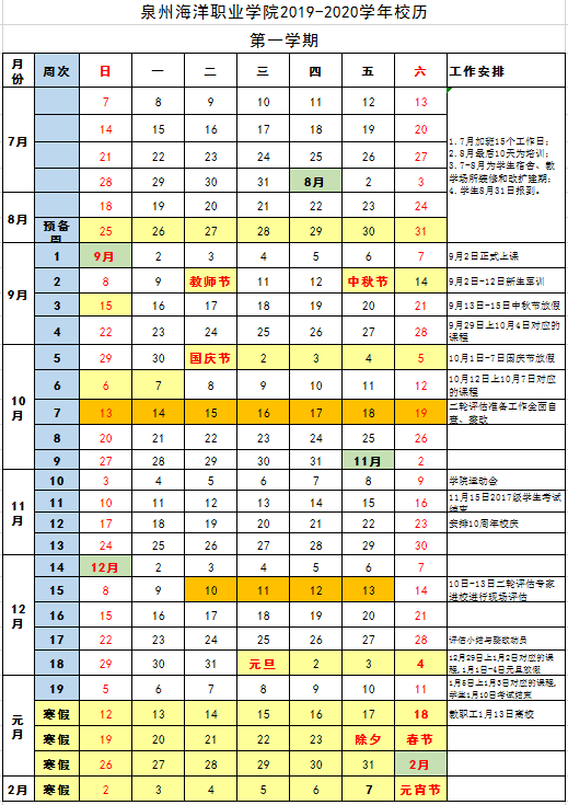 2019-2020学年校历