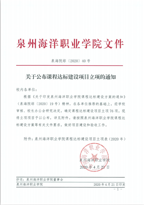 附件:泉海院综〔2020〕40号泉州海洋职业学院课程达标建设项目立项表(2020年)