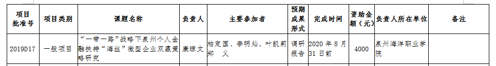 经专家评审、公示,并报市哲学社会科学研究规划领导小组同意,确定2019年泉州市社会科学规划项目课题共113项。其中重大项目1项、重点项目18项、一般项目37项、青年项目20项、社团项目1项、合作项目36项,我校立项1项。