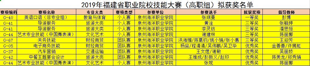 近日,福建省职业院校技能大赛组委会办公室公布“2019年度福建省职业院校技能大赛”活动评选结果。我校共有9个项目18名学生,分别获得高职组一等奖、三等奖、优秀奖,为我校办学以来取得的最好成绩!