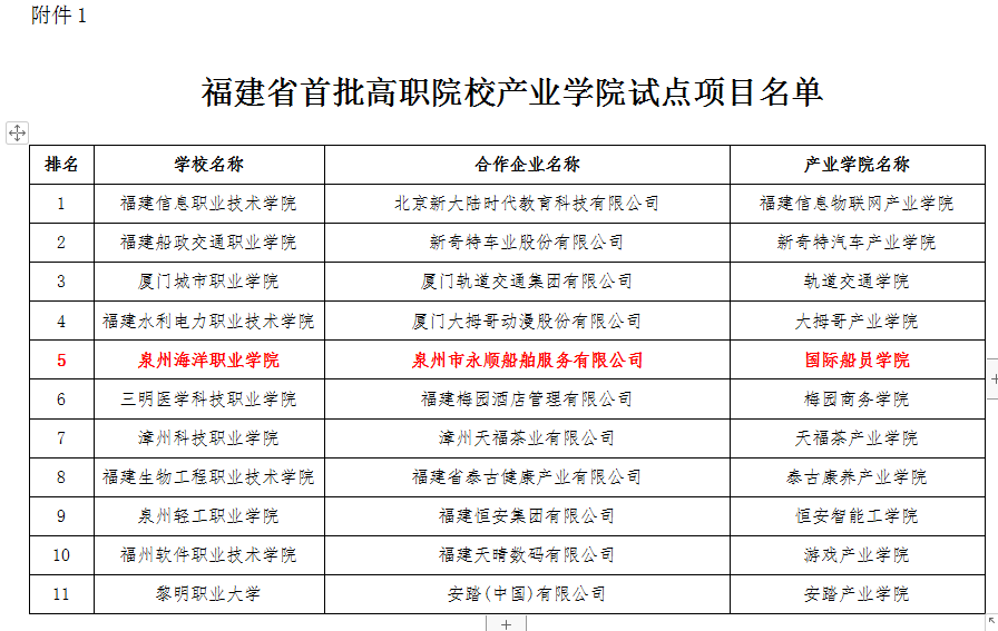 近日,福建省教育厅下发《福建省教育厅关于公布福建省首批高职院校产业学院试点项目的通知》,泉州海洋职业学院与泉州市永顺船舶服务有限公司合作共建的国际船员学院正式被批为福建省首批高职院校产业学院试点项目之一。