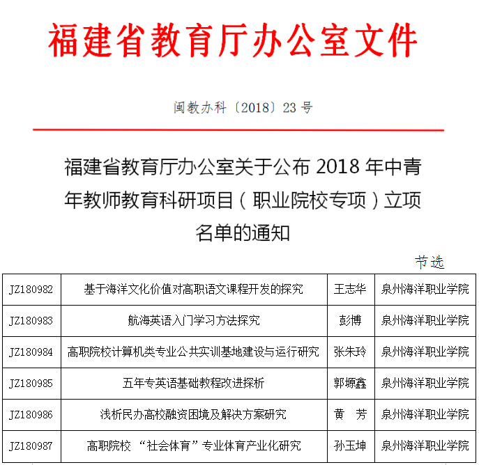经研究,确定836个项目列为2018年福建省中青年教师教育科研项目(职业院校专项)。我院6项课题成功立项,现将立项名单予以公布。