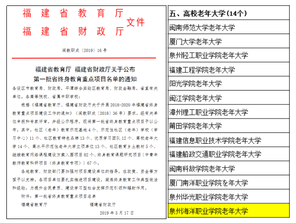 近日,福建省教育厅、福建省财政厅联合下发《福建省教育厅 福建省财政厅关于公布第一批省终身教育重点项目名单的通知》,泉州海洋职业学院老年大学正式被批为“高校老年大学”重点建设项目。