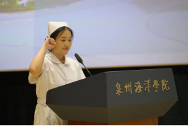 石狮市总医院护理部主任邱明霞等来宾及教师代表为我校2022级300余名即将奔赴临床实践一线的护理学子授帽传烛,并见证他们庄严宣誓。