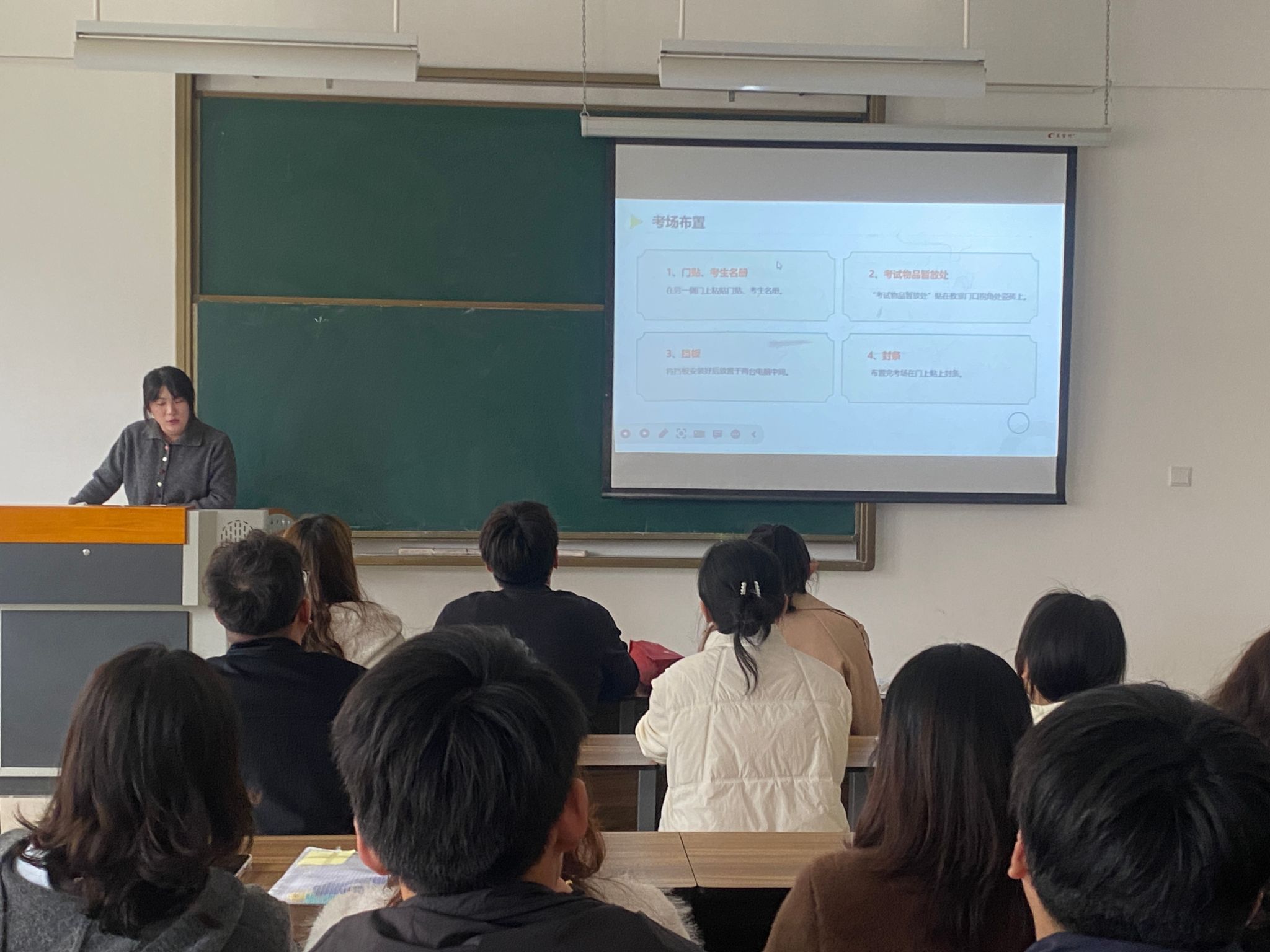 3月28日中午12:10,考务组在3201教室组织召开考前培训会,就考试工作流程、监考人员须知等重点内容进行系统培训,并对技术保障、安全保卫、后勤服务、宣传引导等关键环节进行周密部署,确保各个环节责任到岗、落实到人。