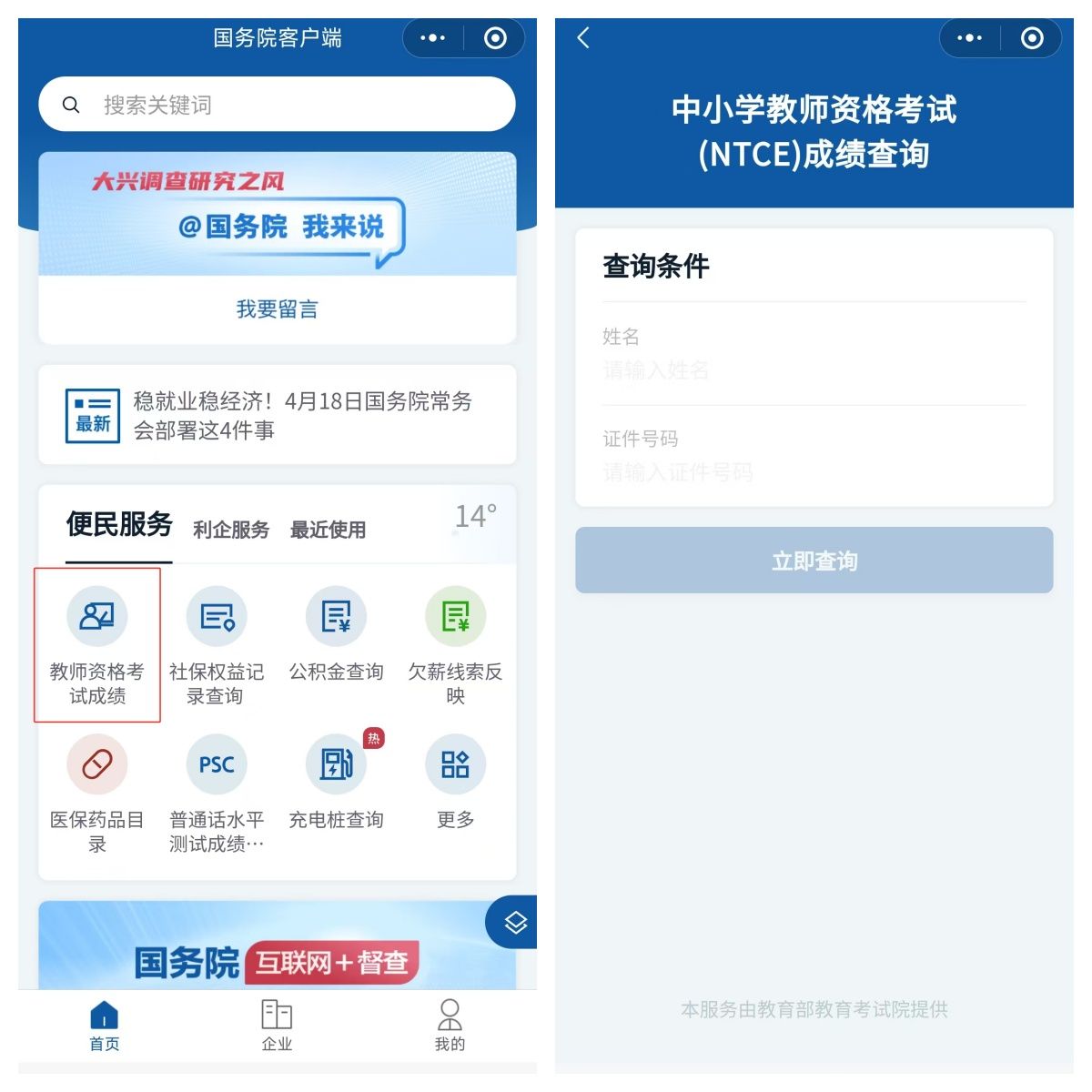 打开国务院客户端小程序,进入中小学教师资格考试成绩查询页面,输入【姓名】和【证件号码】,即可查笔试结果。