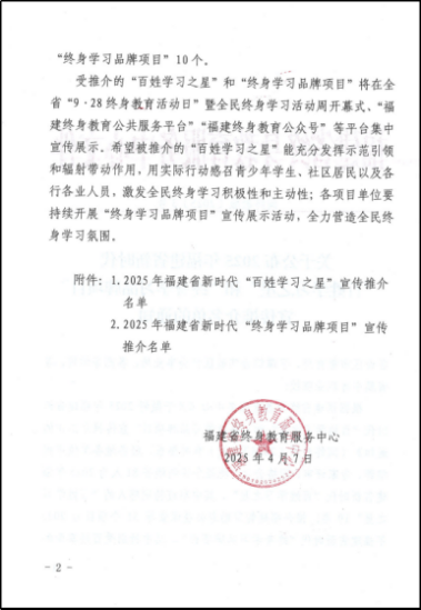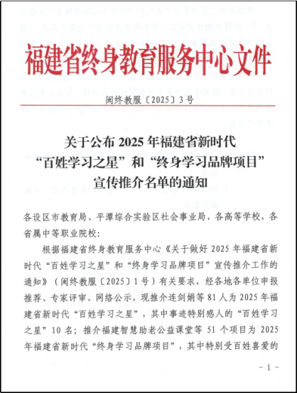 日前,福建省终身教育服务中心公布了2025年福建省新时代“百姓学习之星”和“终身学习品牌项目”名单,我校《戎耀续航·智学行》入选2025年福建省新时代“终身学习品牌项目”。