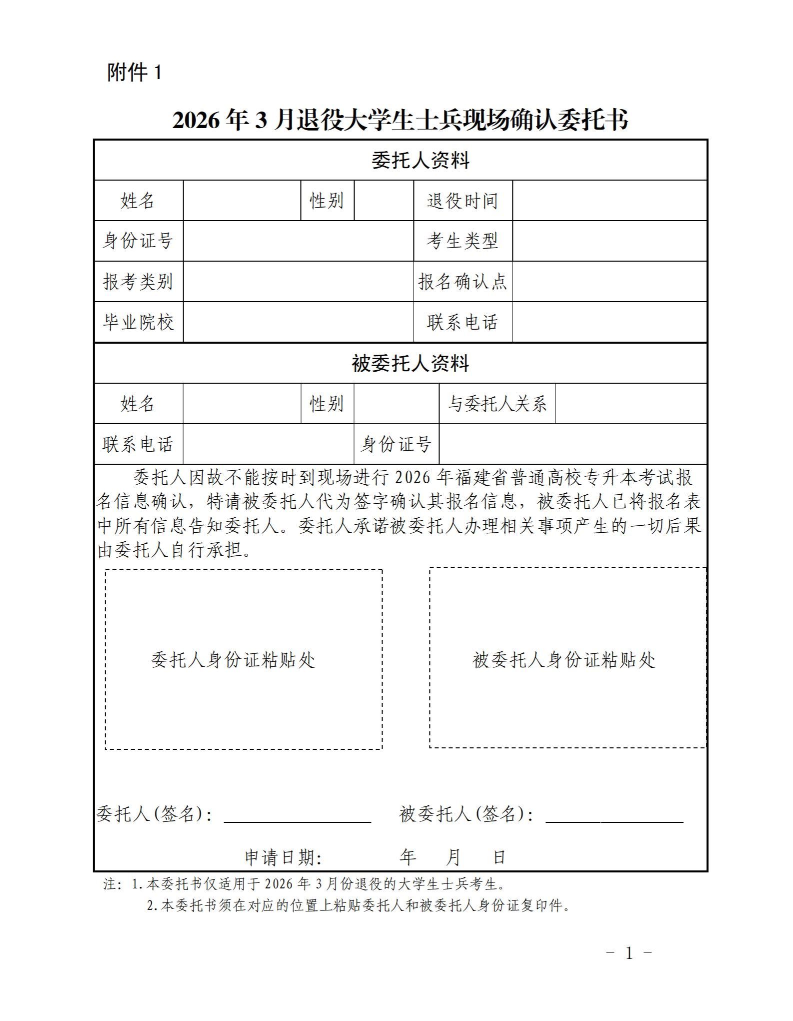 (7)拟于2026年3月退役的大学生士兵若确实无法按时到现场确认的,可委托他人在规定的时间内到相应的确认点办理确认手续,逾期不予受理。现场确认时,除了退役大学生士兵须提供的常规材料外,还须提供以下材料:①2026年退役大学生士兵考生报名现场确认委托书。②委托人的士兵退役说明,即由所在团级以上部队政治机关出具的2026年3月退役说明,内容应包含考生姓名、身份证号码、入伍时间和拟退役时间(或服役期满时间)。具体可咨询省退役军人事务厅0591-87591175。