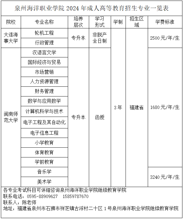 泉州海洋职业学院继续教育学院2024年成人高等教育招生专业一览表