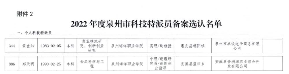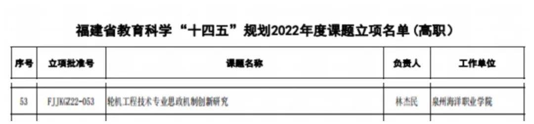 近日,福建省教育科学研究所公布了福建省教育科学“十四五”规划2022年度课题立项结果名单,我校林杰民副院长、副教授主持课题《轮机工程技术专业思政机制创新研究》获批立项;泉州市科学技术局公布了2022年度泉州市科技特派员备案选认结果,经济管理学院黄金帅副院长、副教授、郑天明助理研究员成功选认2022年度个人科技特派员。