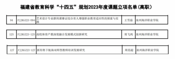 近日,福建省教育科学研究所公布了福建省教育科学“十四五”规划2023年度课题立项结果名单(https://www.fjedusr.cn/html/lm06/6338.html),我校申报的三项课题全部获批立项!三项分别是王雪茹副教授主持课题《艺术设计专业群岗课赛证综合育人增强职业教育适应性的探索与实践》、郑飞鸿讲师主持课题《高校体育产教深度融合发展模式创新研究》、周范超实验师主持课题《新形势下航海双师型教师培训发展研究》。