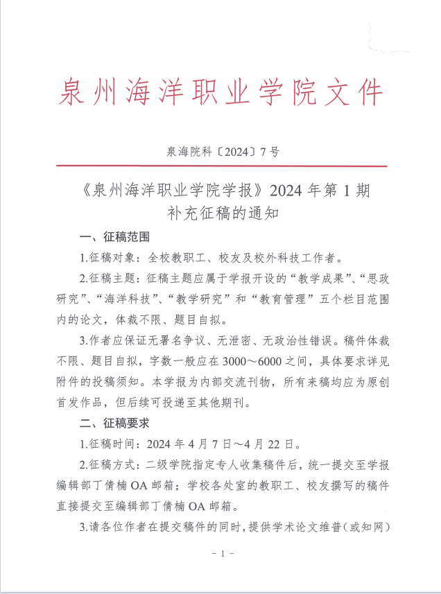 泉海院科〔2024〕7号《泉州海洋职业学院学报》2024年第1期补充征稿的通知.pdf