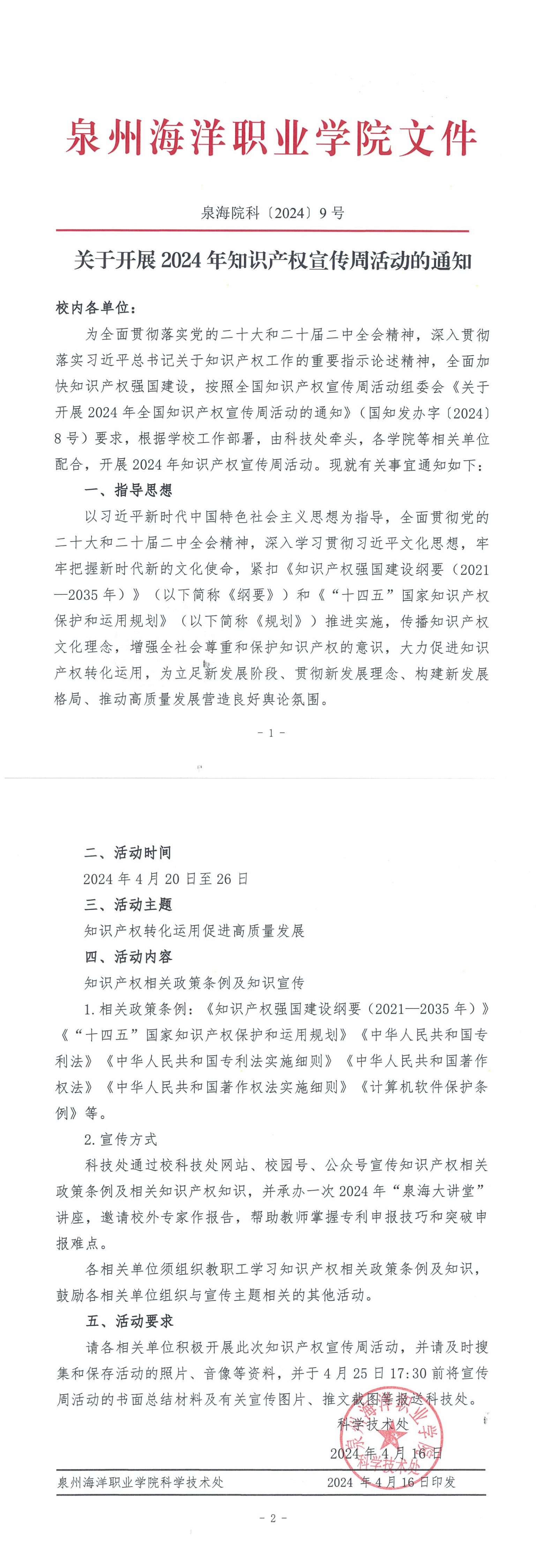 【活动】泉海院科〔2024〕9号 关于开展2024年知识产权宣传周活动的通知