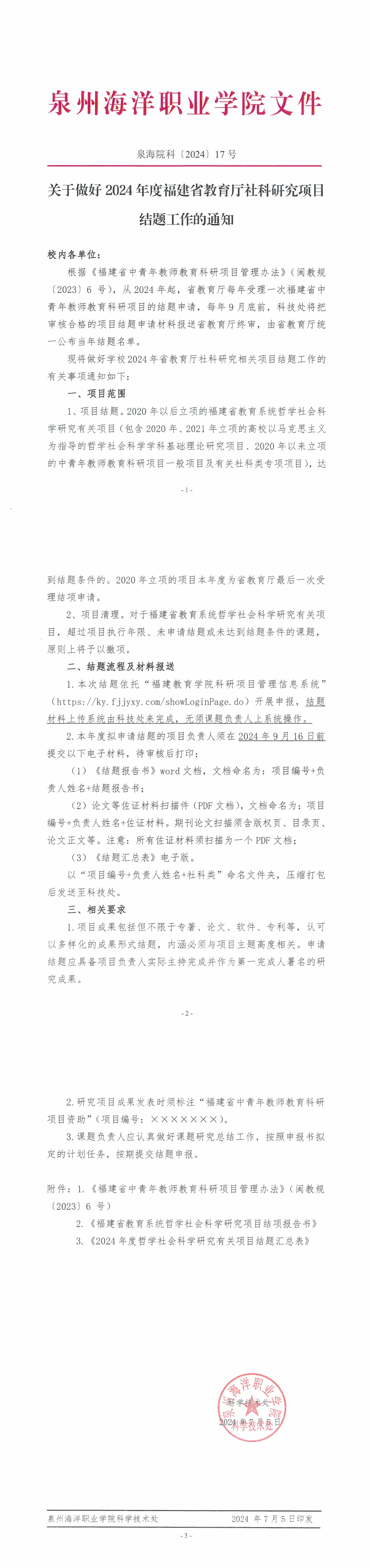 【结题】关于做好2024年度福建省教育厅社科研究项目结题工作的通知 泉海院科〔2024〕17号