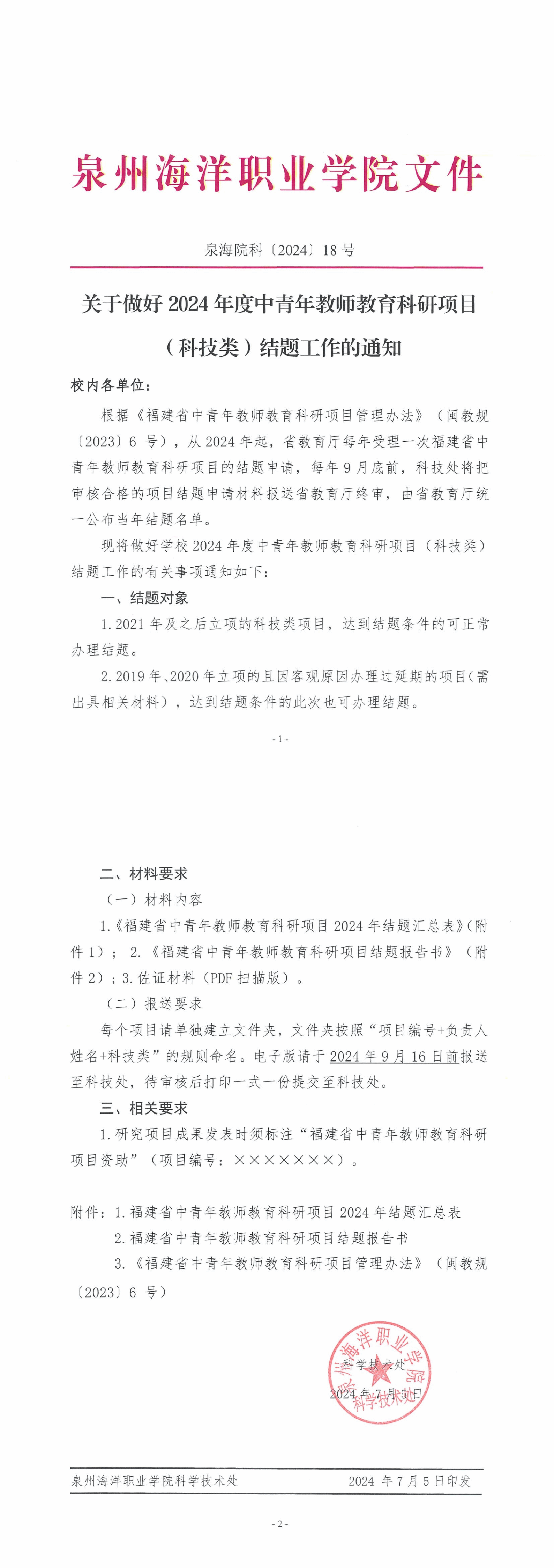 【结题】关于做好2024年度中青年教师教育科研项目(科技类)结题工作的通知 泉海院科〔2024〕18号