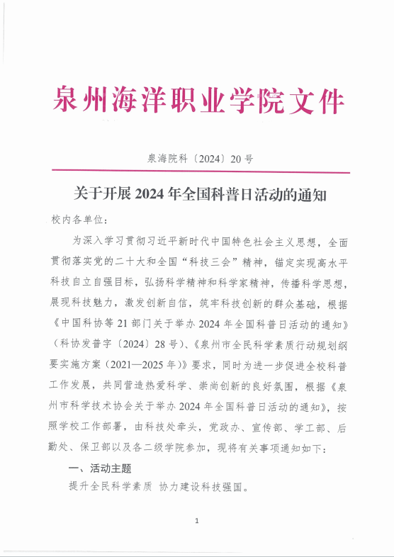 【通知】泉海院科〔2024〕20号 关于开展2024年全国科普日活动的通知