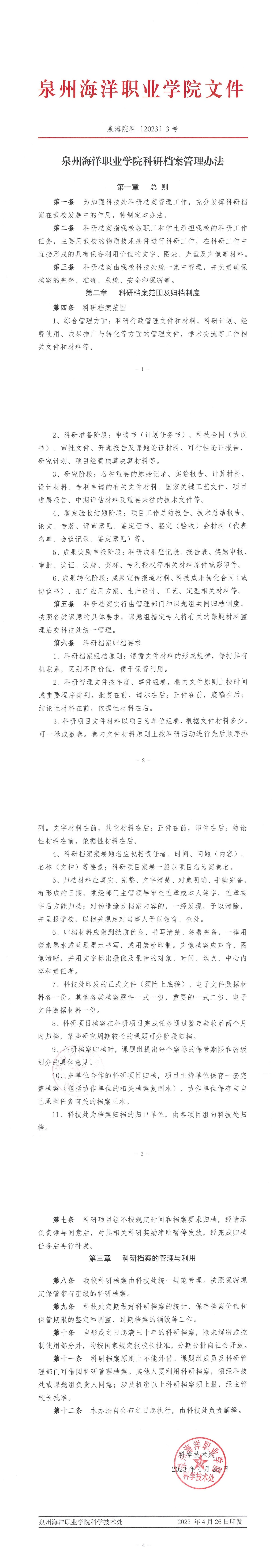 泉海院科〔2023〕3号 泉州海洋职业学院科研档案管理办法