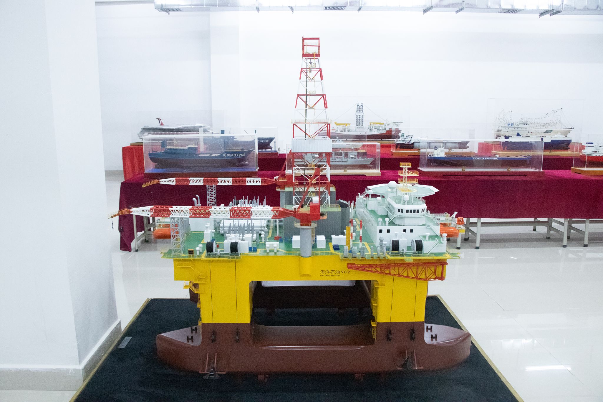 (世界特种船展区:通过船模和图片两种形式展示超大型钻井船、邮轮、集装箱轮、油轮、航母、战舰等全球最先进船舶。)