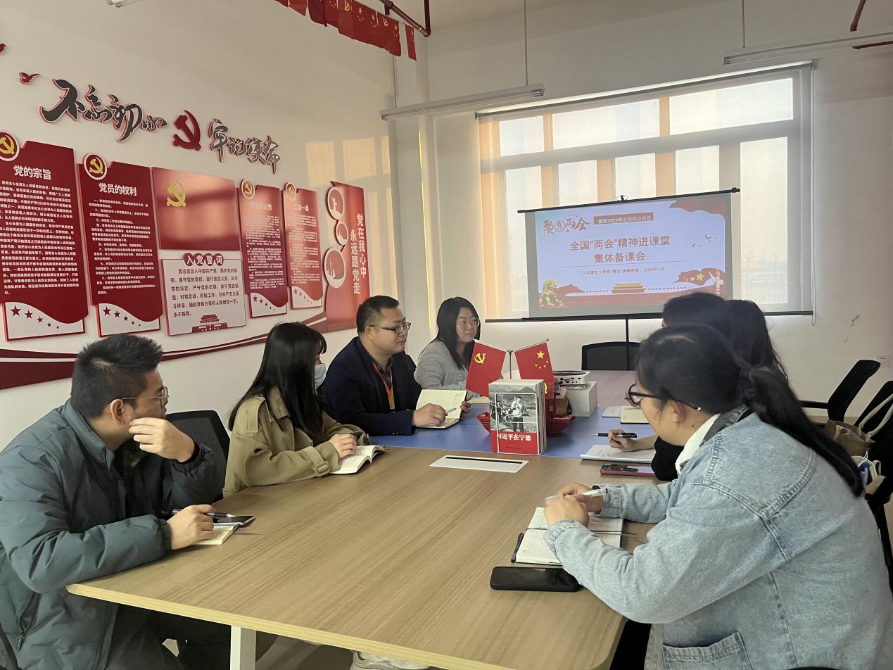 为深入学习贯彻全国“两会”精神,迅速掀起传达学习“两会”精神热潮,全力推动“两会”精神进思政课堂、进学生头脑,3月15日下午,马克思主义学院在图书馆西侧4楼活动室召开全国“两会”精神融入思政课教学暨“同备一堂课”活动,学院全体思政课教师参加集体备课会,会议由学院副院长陈建清主持。