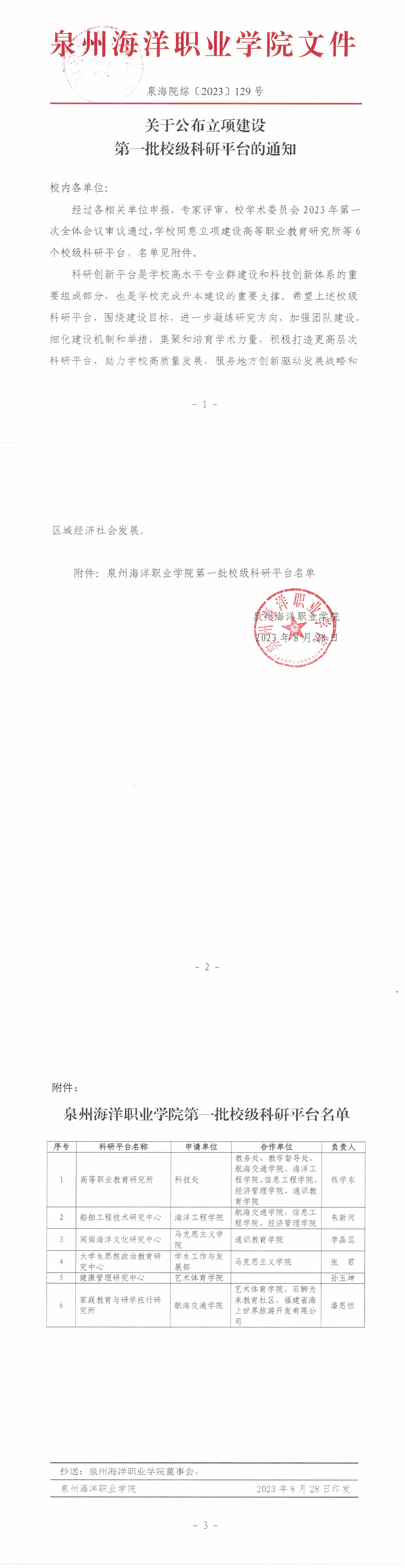 2023年8月28日,根据《关于公布立项建设第一批校级科研平台的通知》(泉海院综〔2023〕129号),我院申报的“闽南海洋文化研究中心”(项目负责人:李晶蕊)入选学校首批校级科研创新平台。
