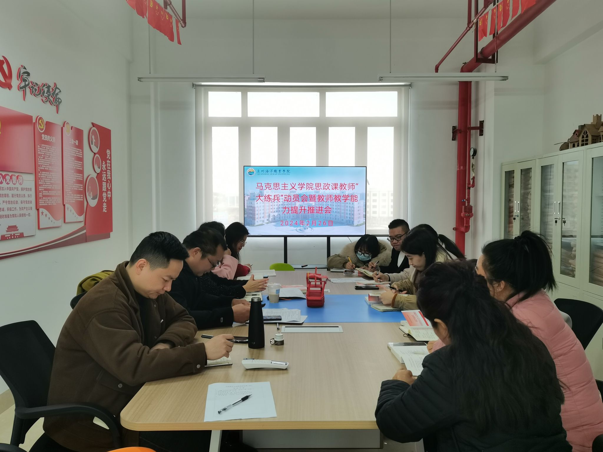 为深入学习贯彻习近平总书记在学校思想政治理论课教师座谈会上的重要讲话精神和“大思政课”重要指示精神,按照《福建省教育厅关于开展全省思政课教师“大练兵”交流展示活动的通知》(闽教思〔2024〕6 号)和《中共泉州市委教育工委 泉州市教育局关于开展全市思政课教师“大练兵”交流展示活动的通知》(泉委教便函〔2024〕2 号)的要求,2024年2月26日,我院在图书馆4楼马院活动室召开思政课教师“大练兵”动员会暨教师教学能力提升推进会。