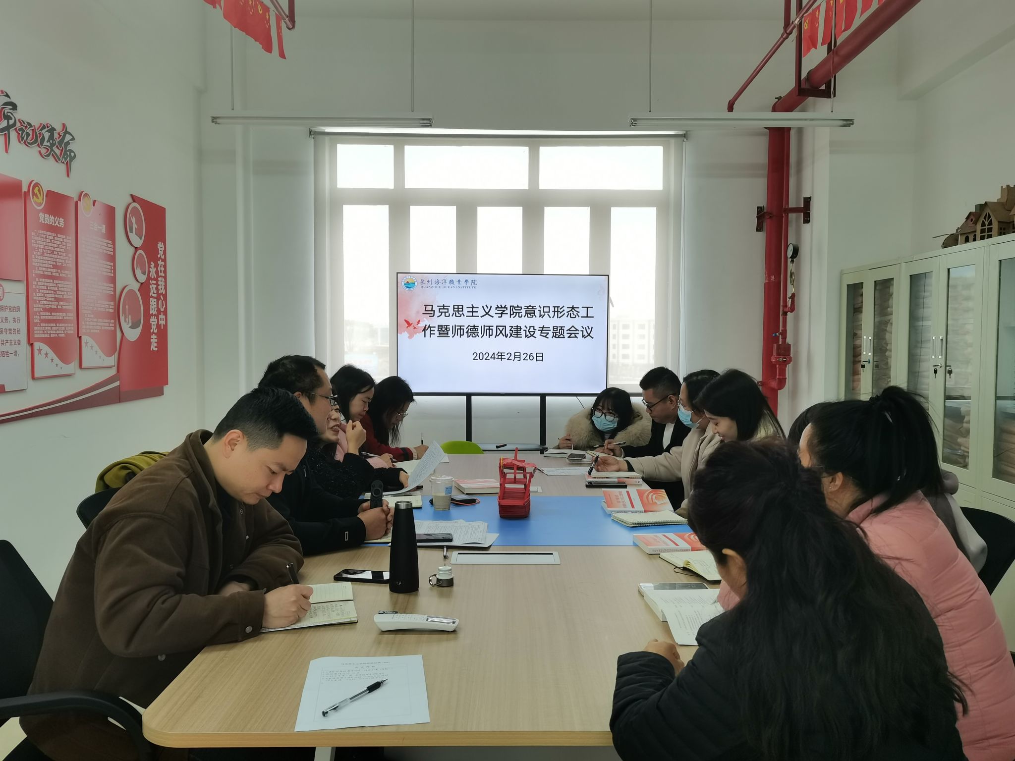 近日,我院在图书馆4楼马院活动室召开意识形态工作暨师德师风建设专题会议,此次会议旨在深入贯彻落实习近平新时代中国特色社会主义思想,进一步强化学院教师队伍的意识形态教育和师德师风建设,提升教育教学质量,营造积极健康向上的育人环境。