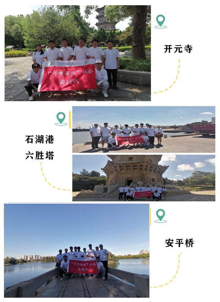 为深入学习贯彻党的二十大精神,贯彻落实习近平总书记关于思想政治理论课的指示精神,7月11日至13日,我院青年教师陈建清、李晶蕊、曾珊珊、邱国切带领“寻梦海丝”社会实践队前往“泉州:宋元中国的世界海洋商贸中心”的代表性古迹遗址,开展以“探寻海丝遗迹·传承中华优秀传统文化”为主题的“行走的思政课”暑期社会实践活动。
