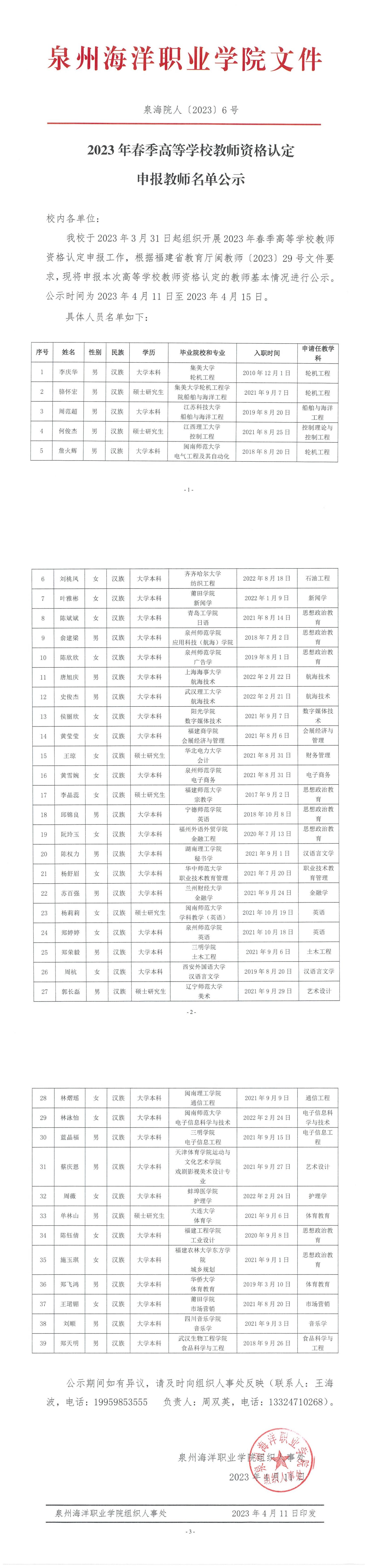 2023年春季高等学校教师资格认定申报教师名单公示