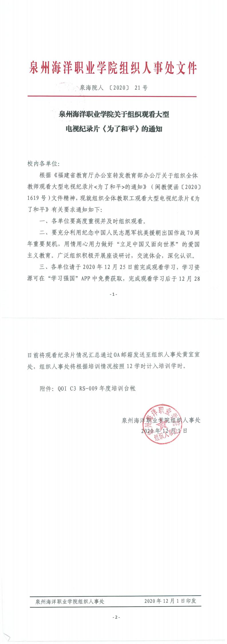 泉州海洋职业学院关于组织观看大型电视纪录片《为了和平》的通知