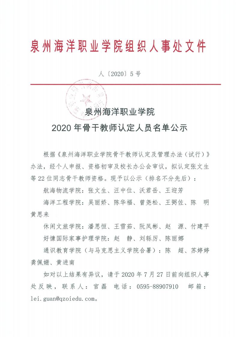 泉州海洋职业学院2020年骨干教师认定人员名单公示