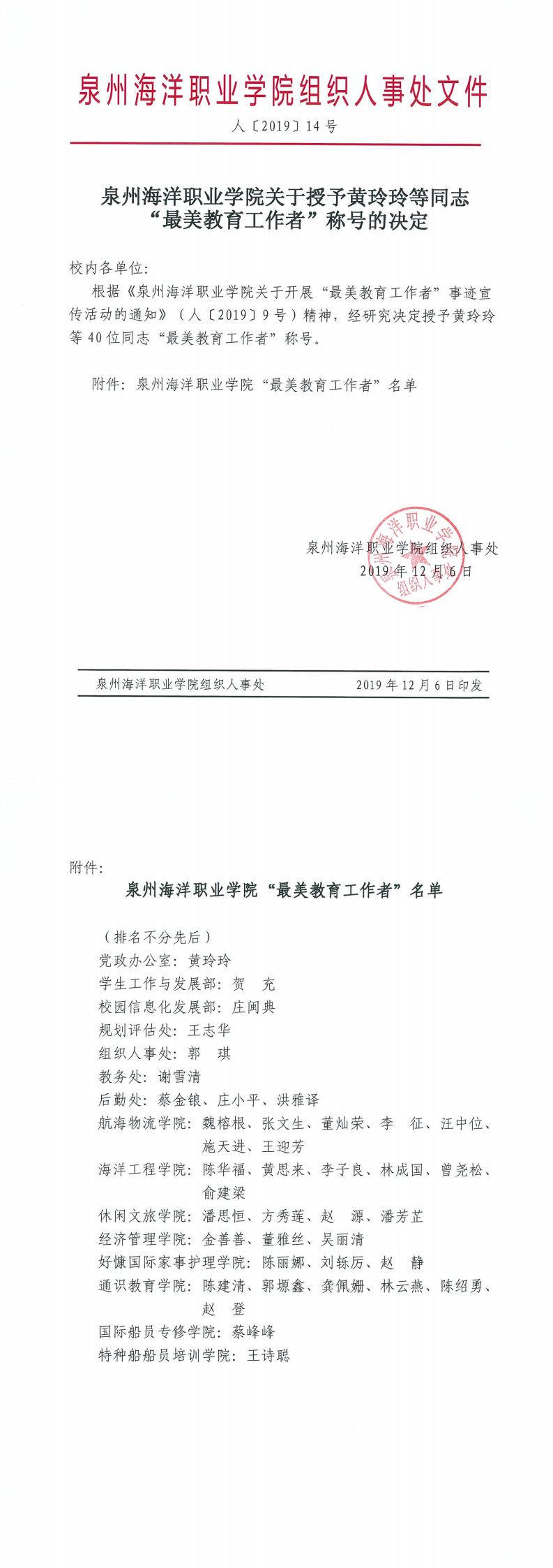 泉州海洋职业学院关于授予黄玲玲等同志“最美教育工作者”称号的决定
