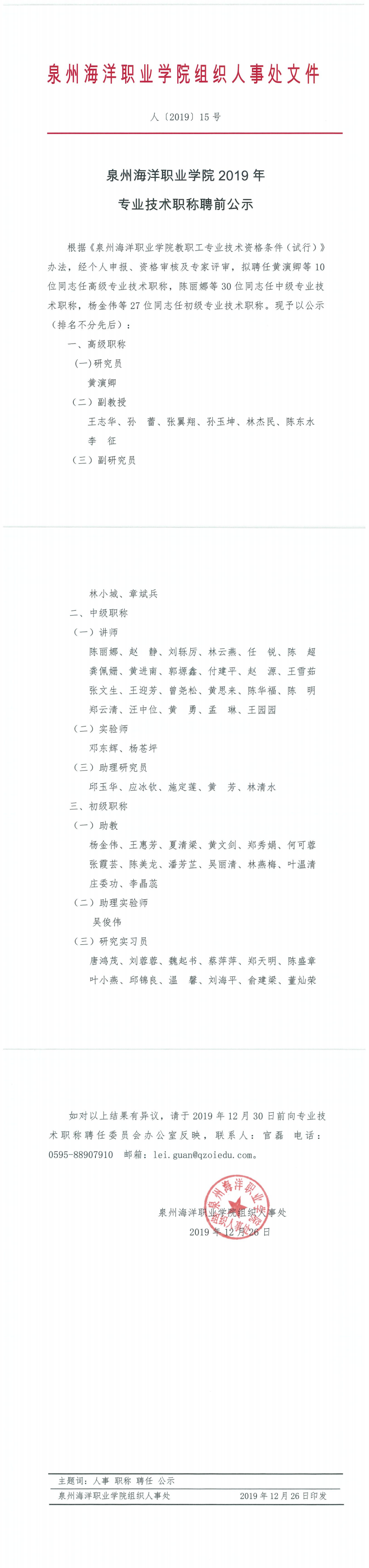 泉州海洋职业学院2019年专业技术职称聘前公示
