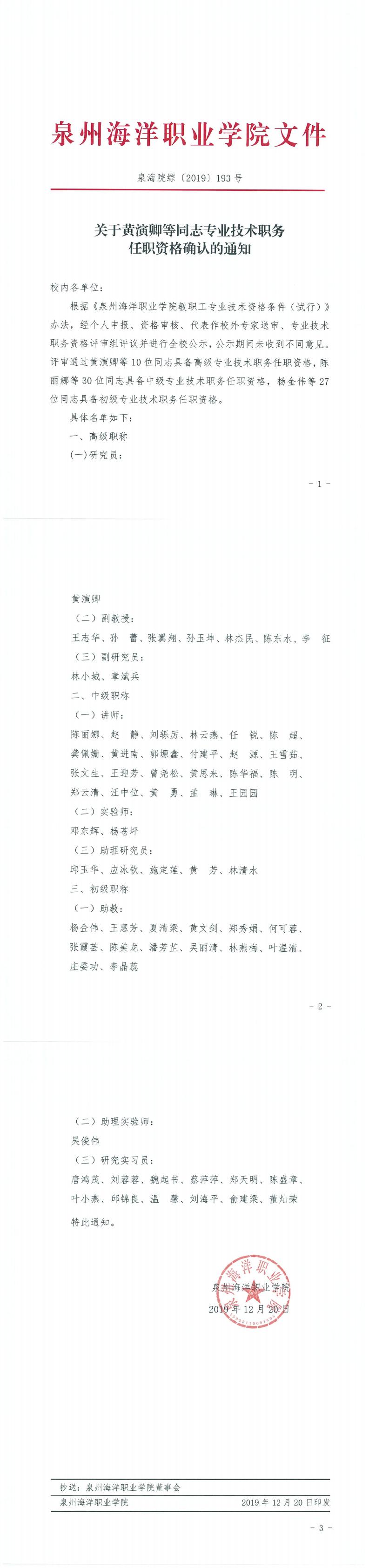关于黄演卿等同志专业技术职务任职资格确认的通知