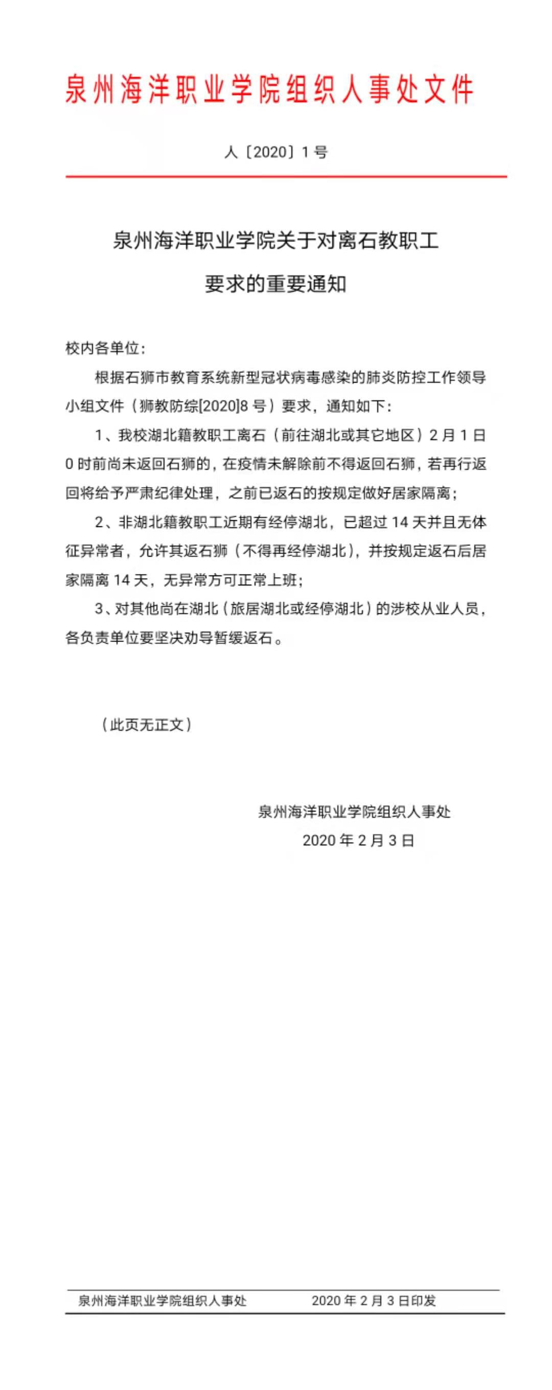泉州海洋职业学院关于对离石教职工要求的重要通知