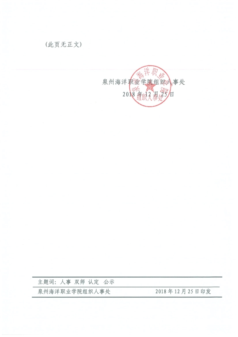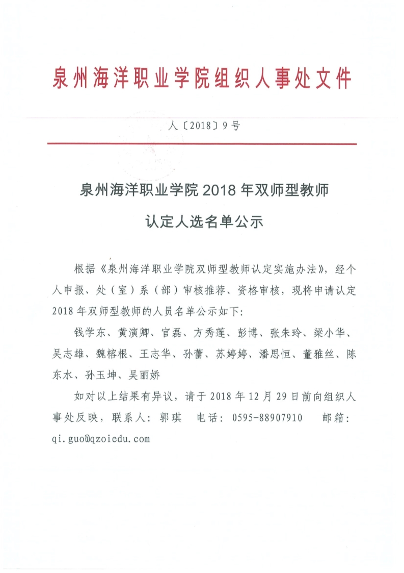 人〔2018〕9号 泉州海洋职业学院2018年双师型教师认定人选名单公示