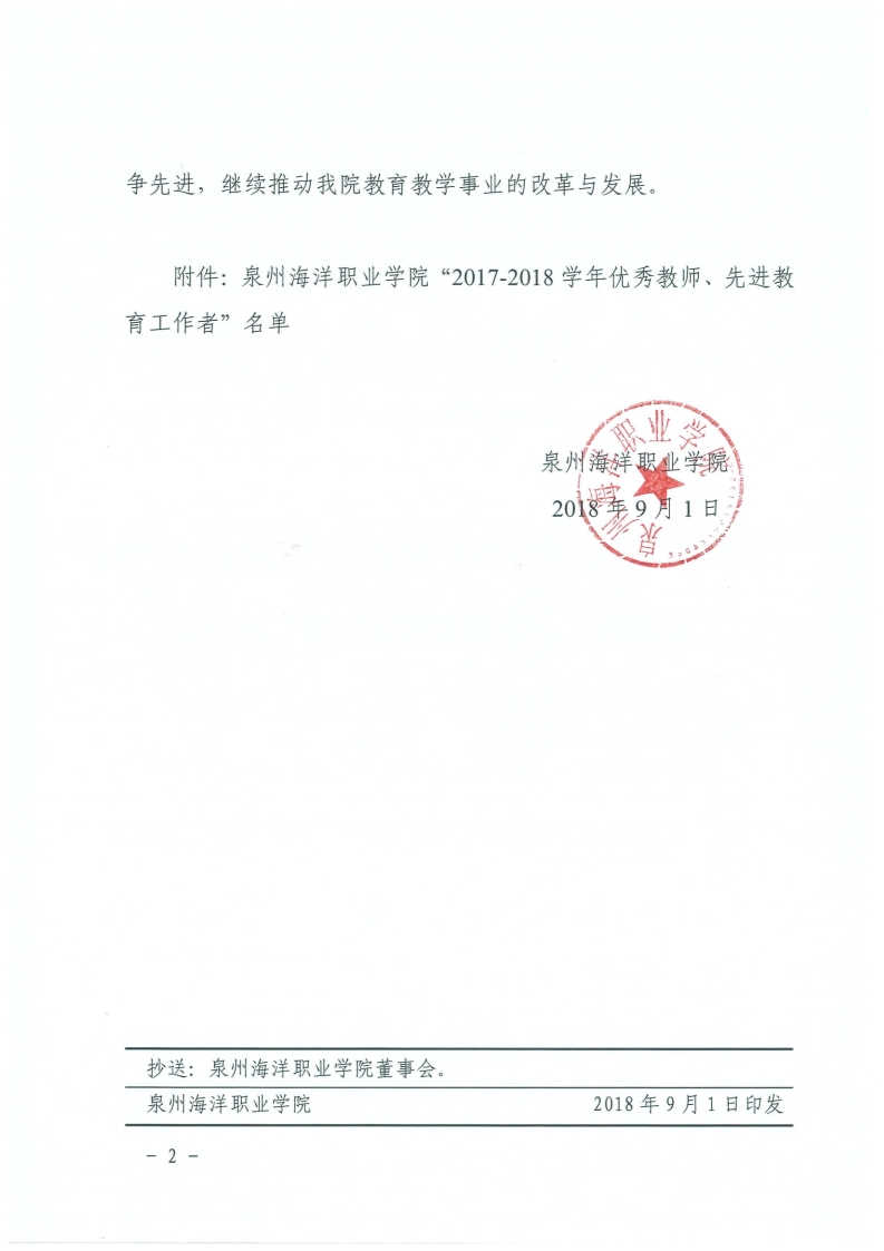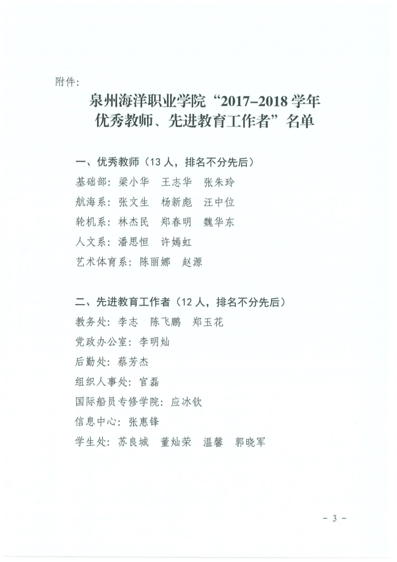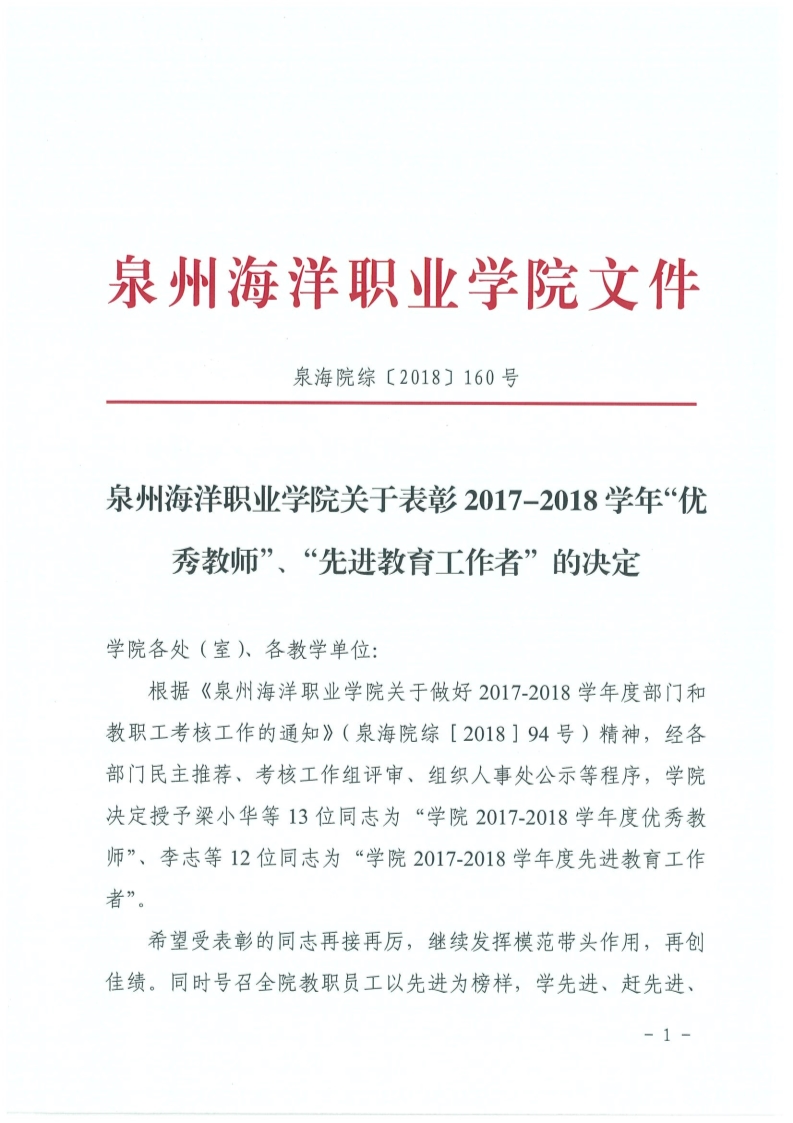 泉海院综〔2018〕160号泉州海洋职业学院关于表彰2017-2018学年“优秀教师”、“先进教育工