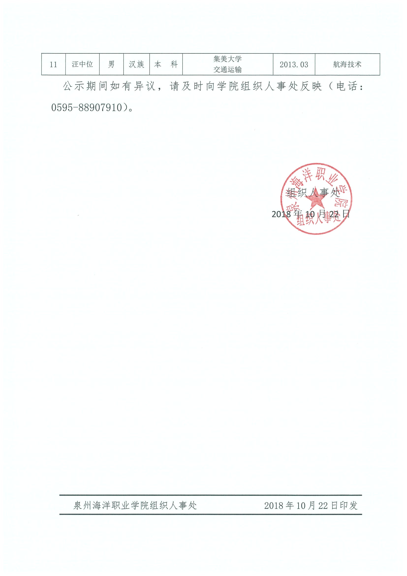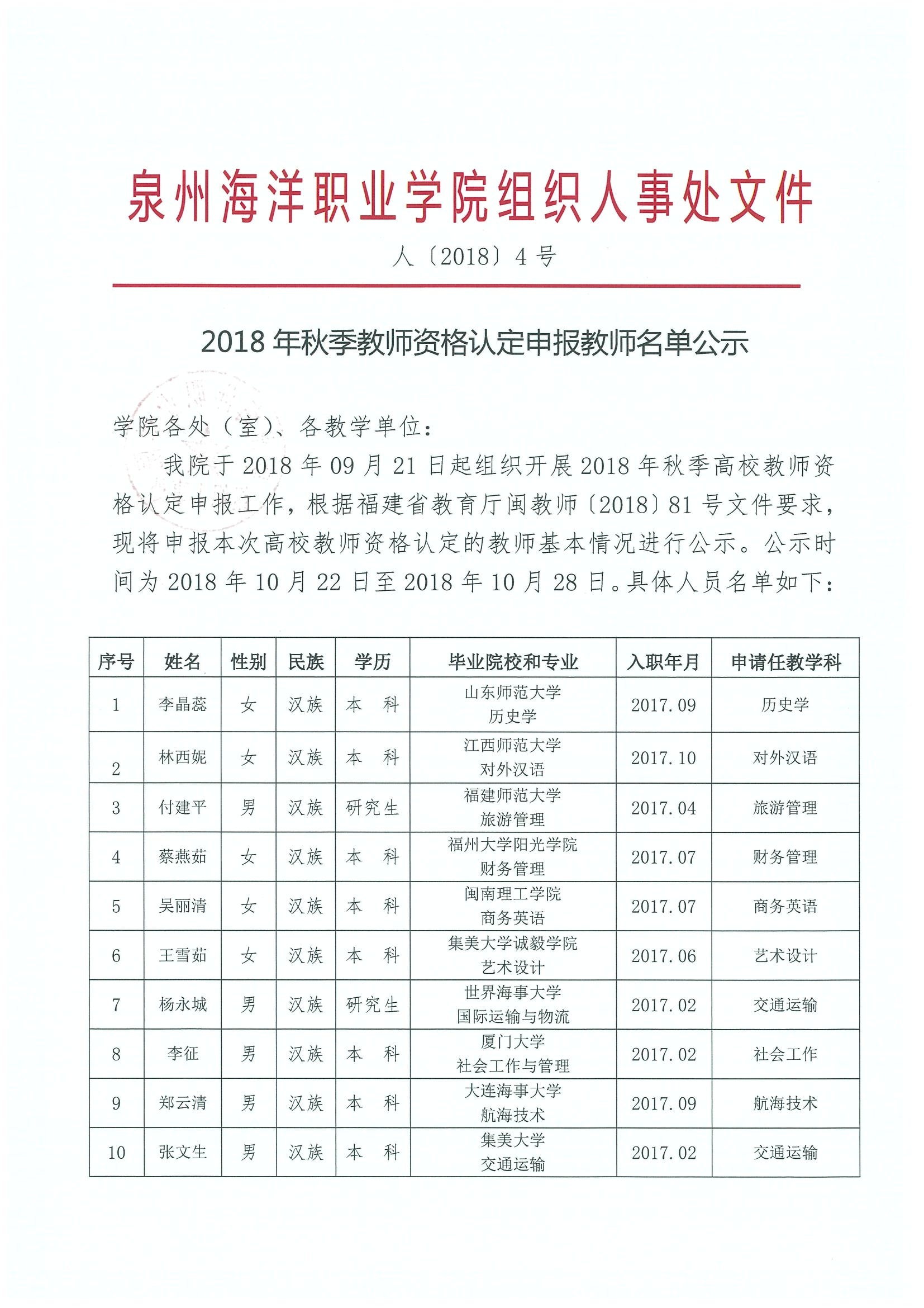 人〔2018〕4号 泉州海洋职业学院2018年秋季教师资格认定组织人事处公示