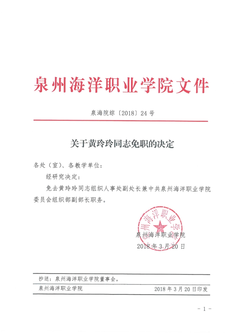 泉海院综〔2018〕24号 关于黄玲玲同志免职的决定