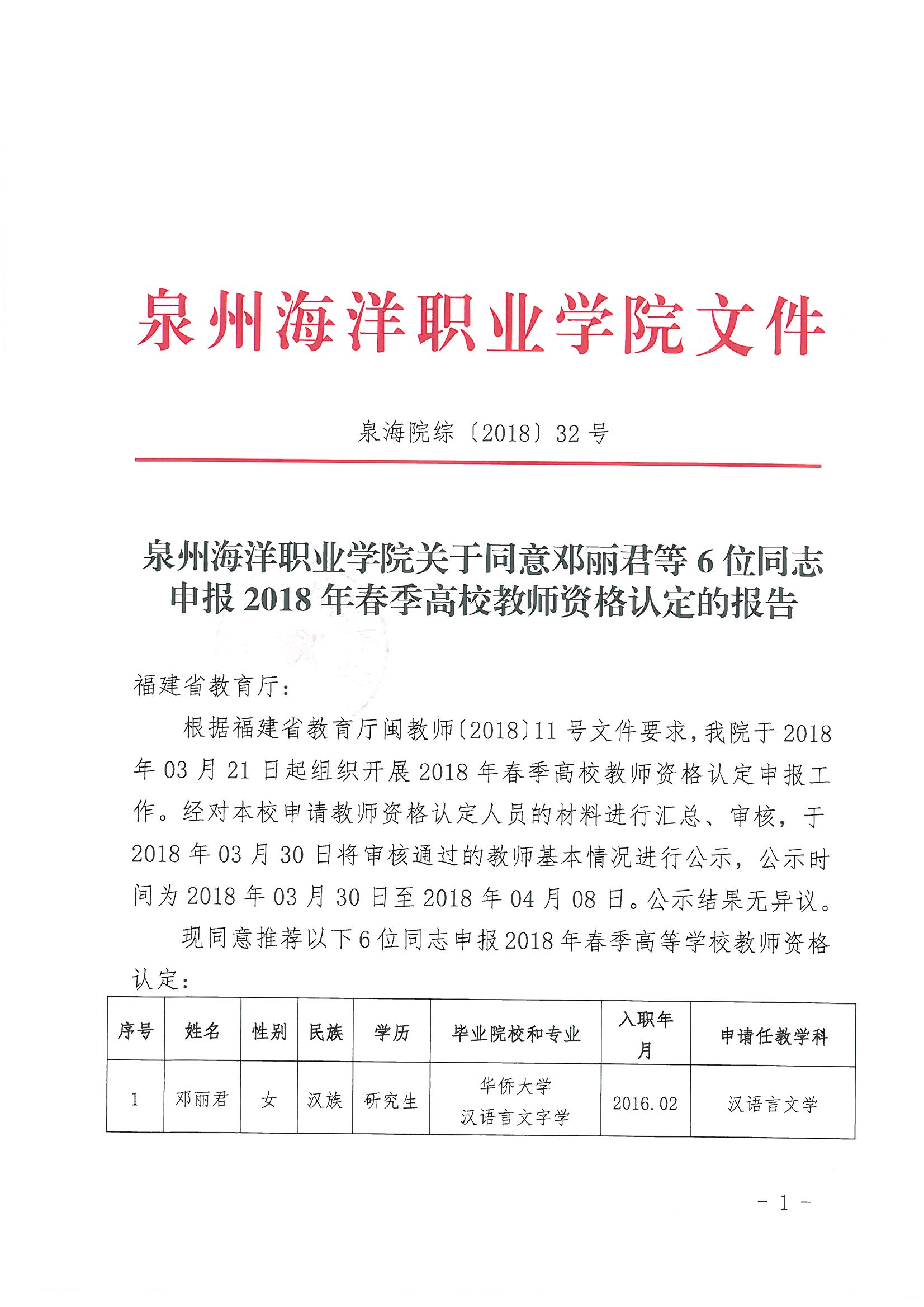 于同意邓丽君等6人申报2018年春季教师资格认定的报告