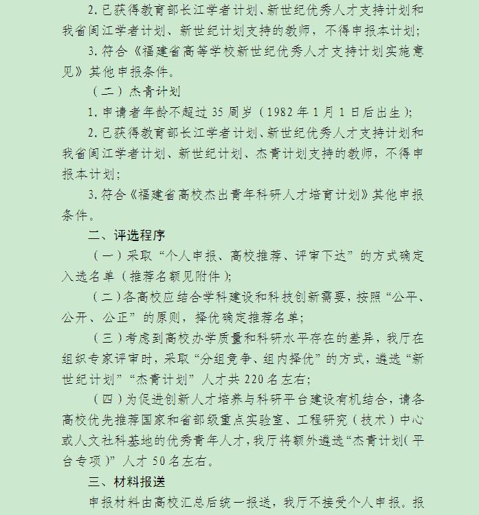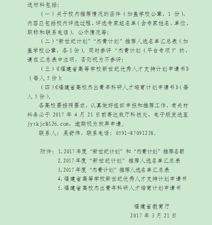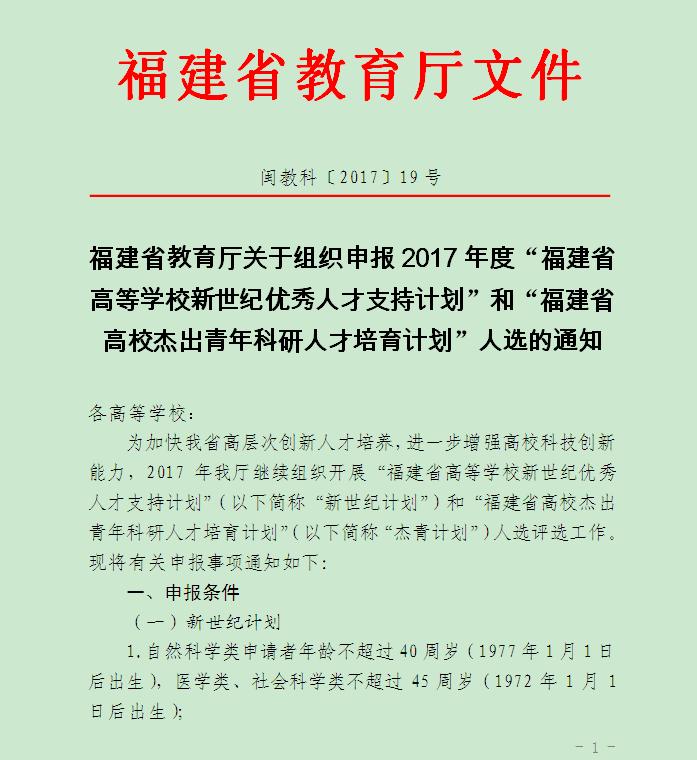 关于组织申报2017年度“福建省高等学校新世纪优秀人才支持计划”和“杰出青年科研人才培育计划”的通知