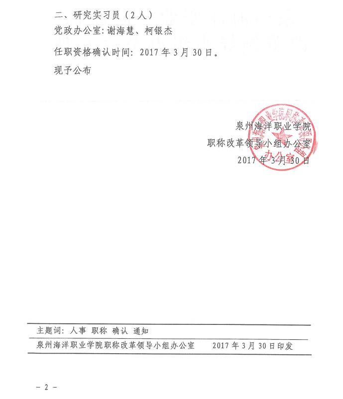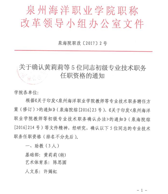 泉海院职改〔2017〕2号 关于确认黄莉莉等5位同志初级专业技术职务任职资格的通知