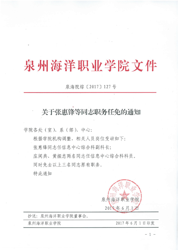 泉海院综[2017]127号 关于张惠锋等同志职务任免的通知