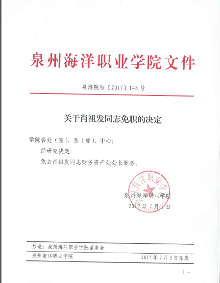 泉海院综[2017]148号关于肖祖发同志免职的决定
