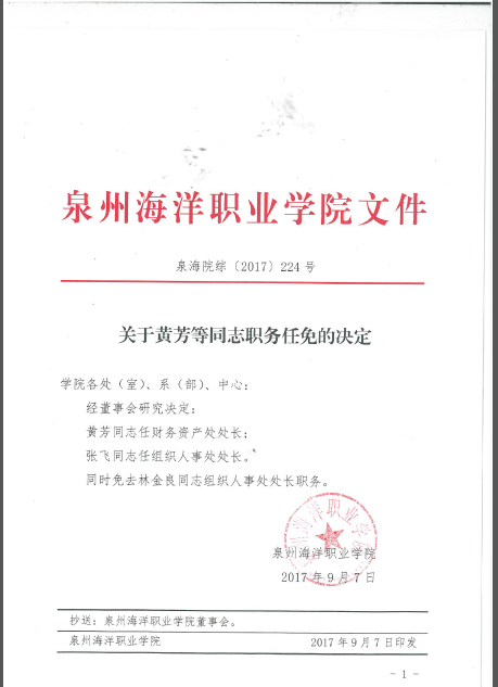泉海院综[2017]224号关于黄芳等同志职务任免的决定