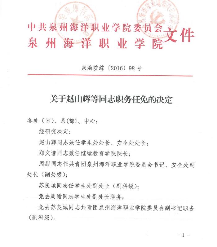 泉海院综【2016】98号 关于赵山辉等同志职务任免的决定