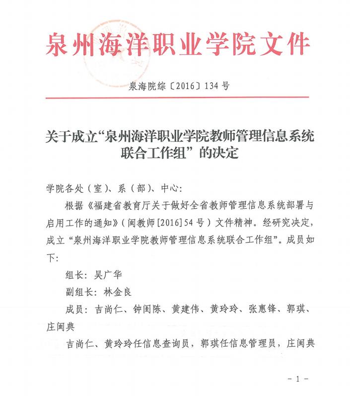 泉海院综【2016】134号 关于成立“泉州海洋职业学院教师管理信息系统联合工作组”的决定