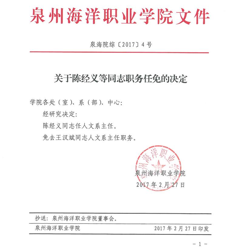 泉海院综〔2017〕4号 关于陈经义等同志职务任免的决定