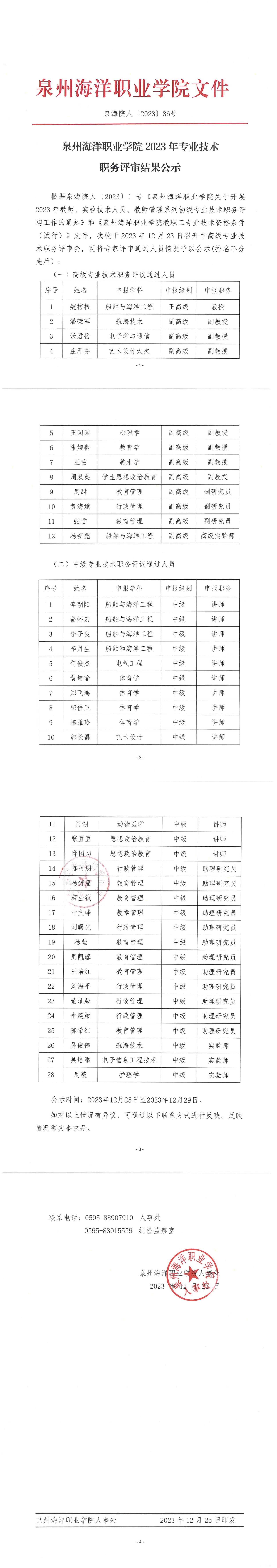 泉州海洋职业学院2023年专业技术职务评审结果公示