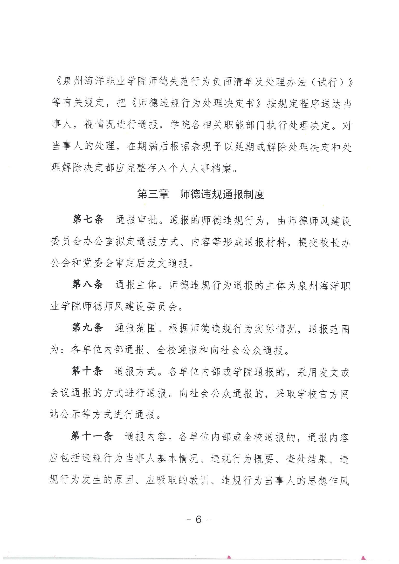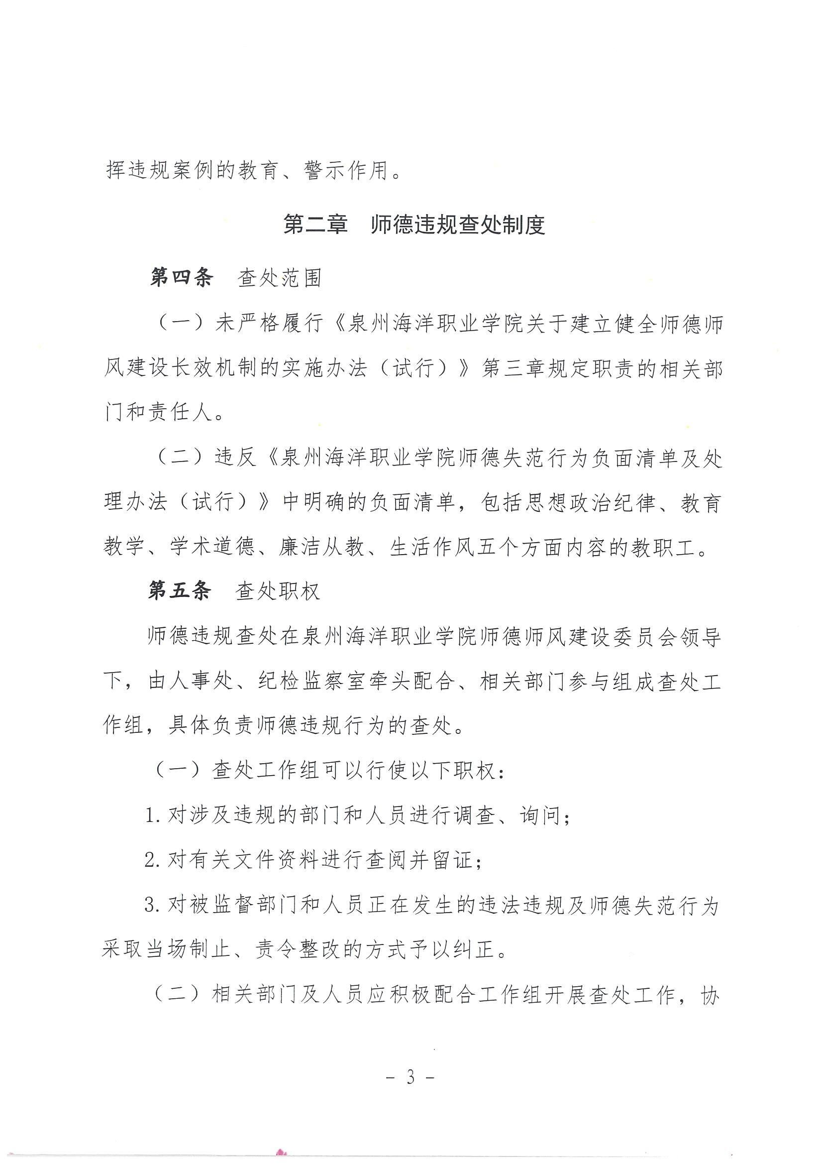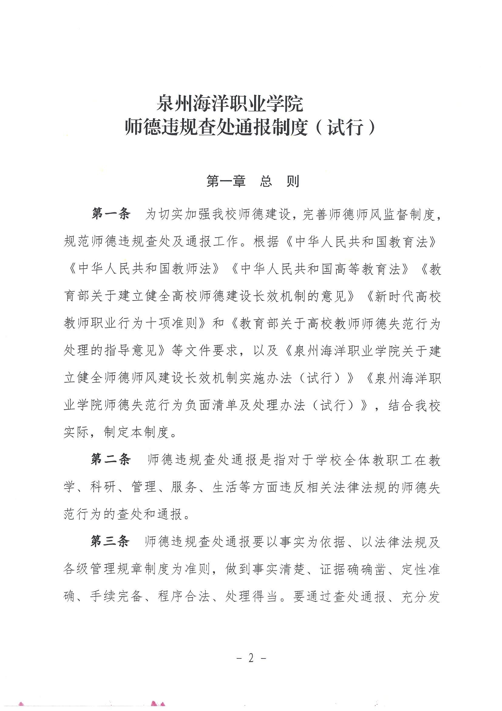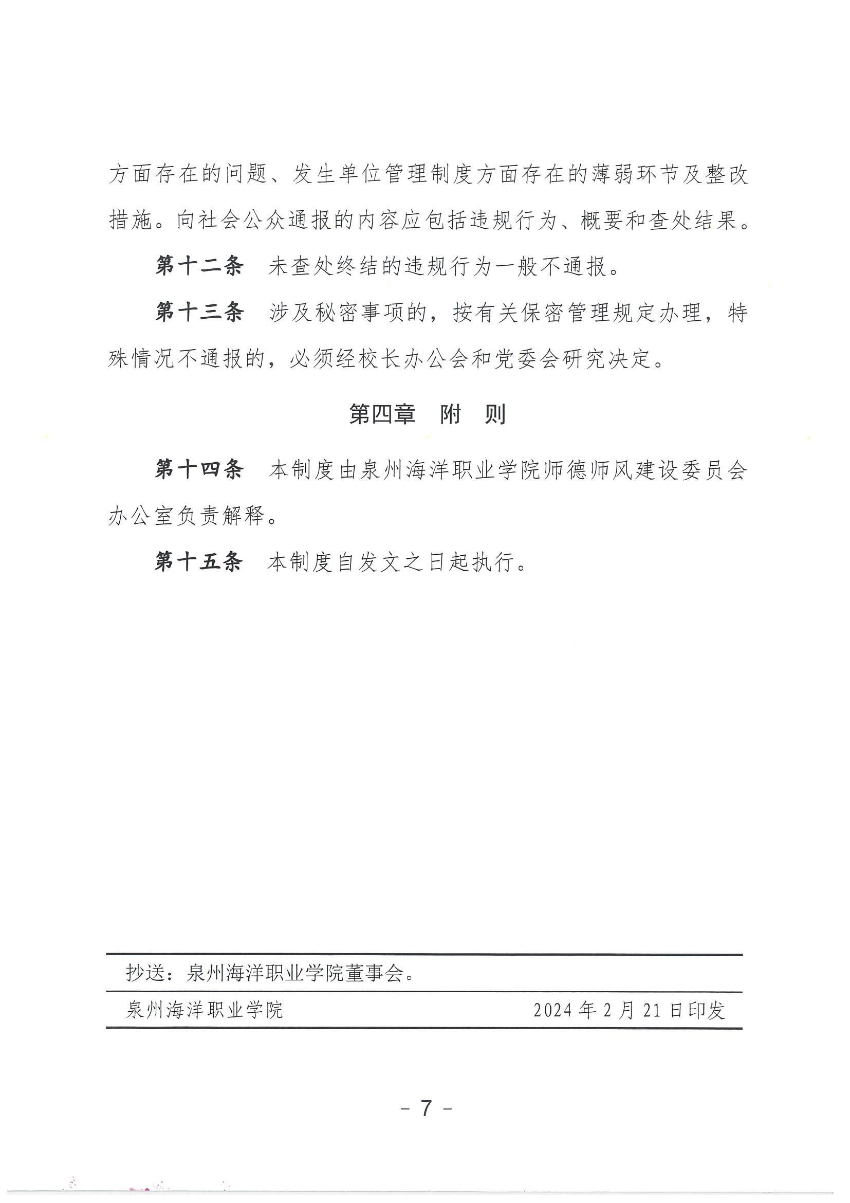 关于印发《泉州海洋职业学院师德违规查处通报制度(试行)》的通知